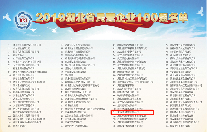 7月30日,省工商聯(lián)發(fā)布了2019湖北省民營企業(yè)百強名單。榜單以2018年企業(yè)營業(yè)收入排序,我司蟬聯(lián)“2019湖北民營企業(yè)100強”第71名,較去年上升4位!