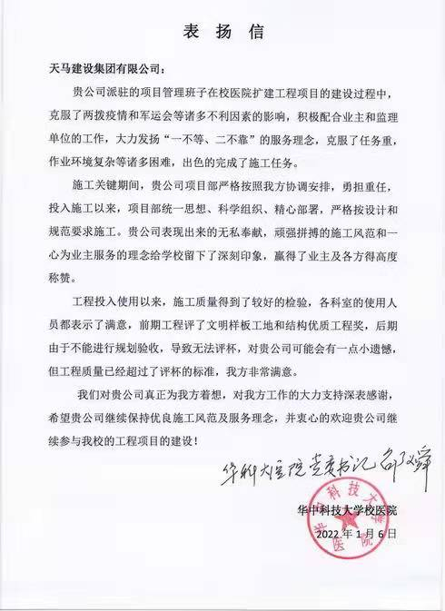 凡是過往,皆為序章。感謝華中科技大學(xué)校醫(yī)院方對天馬建設(shè)集團(tuán)有限公司的支持和認(rèn)可,一封表揚信是認(rèn)可更是繼續(xù)前行的動力。在今后工作中,公司將繼續(xù)秉承“逢建必優(yōu)”的宗旨,發(fā)揚嚴(yán)謹(jǐn)務(wù)實的工作作風(fēng),加強(qiáng)細(xì)節(jié)管控,全力推進(jìn)工程項目,低風(fēng)險、高標(biāo)準(zhǔn)、高質(zhì)量、高服務(wù)的意識,積極完成業(yè)主及公司的各項工作指標(biāo)。