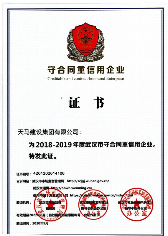 近日,湖北省及武漢市市場(chǎng)監(jiān)督管理局相繼公布了2018-2019年度守合同重信用企業(yè)名單。天馬建設(shè)再次被認(rèn)定為省、市2018-2019年度“守合同重信用”企業(yè)。