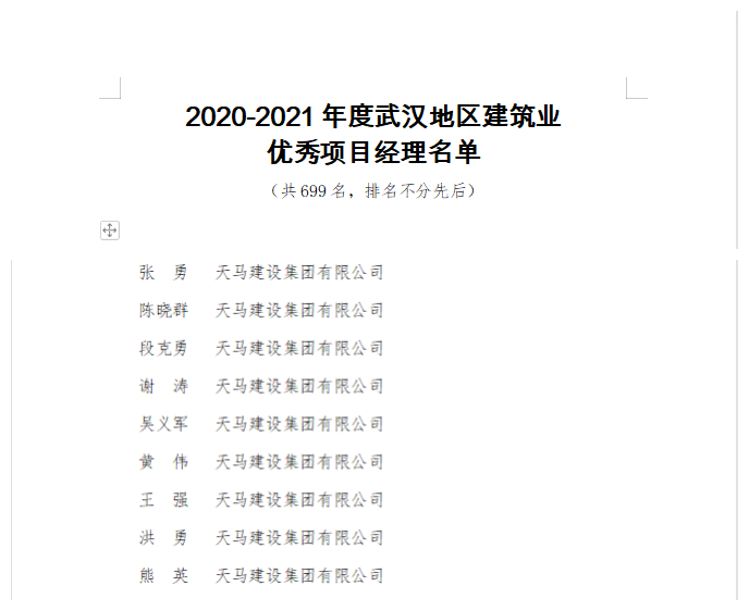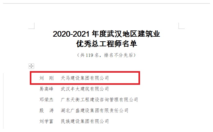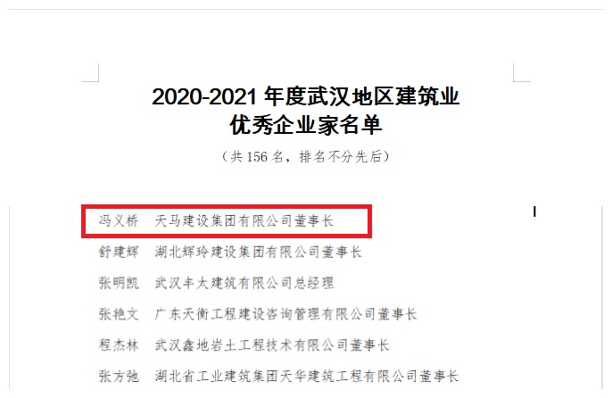 同期,協(xié)會(huì)還發(fā)布了建筑“四優(yōu)”等多項(xiàng)榮譽(yù),公司榮獲武漢地區(qū)建筑業(yè)優(yōu)秀企業(yè);董事長(zhǎng)馮義橋獲評(píng)“優(yōu)秀企業(yè)家”、總工程師劉剛獲評(píng)“優(yōu)秀總工程師”;項(xiàng)目經(jīng)理張勇、黃偉、吳義軍等9人獲評(píng)“優(yōu)秀項(xiàng)目經(jīng)理”。