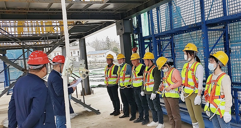 組員之間配合時也要相互溝通,不然因螺栓松動,導(dǎo)致架體脫落,也很容易意外受傷,因此正確佩戴安全帽非常重要。架體安裝完畢后,開始試運(yùn)行,每兩人一組分別管理一個樓層,收起密封走道板并將其固定好,觀察自己所在層防墜裝置、電動葫蘆及鏈條有沒有異常情況。