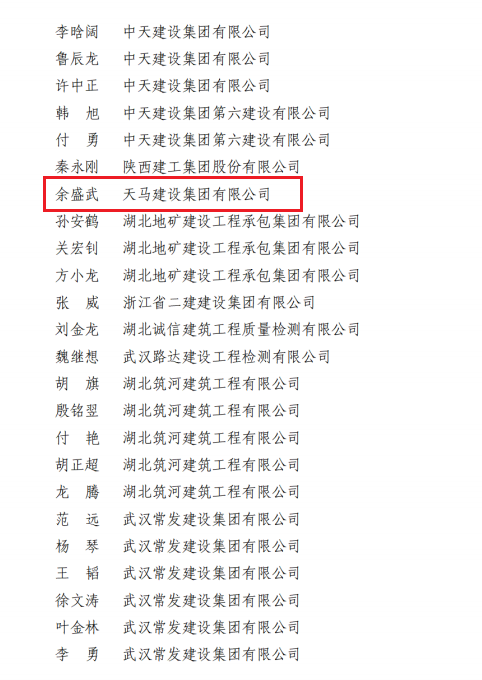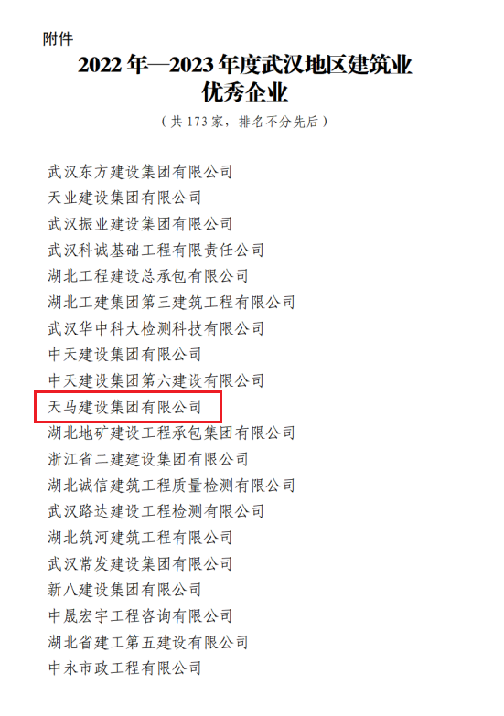近日,天馬建設(shè)集團榮獲2023年度武漢市最具成長性企業(yè)和2022-2023年度武漢地區(qū)建筑業(yè)優(yōu)秀企業(yè),集團黨委書記、董事長馮義橋獲“優(yōu)秀企業(yè)家”,集團總工程師劉剛獲“優(yōu)秀總工程師”,余勝武獲“優(yōu)秀項目經(jīng)理”。